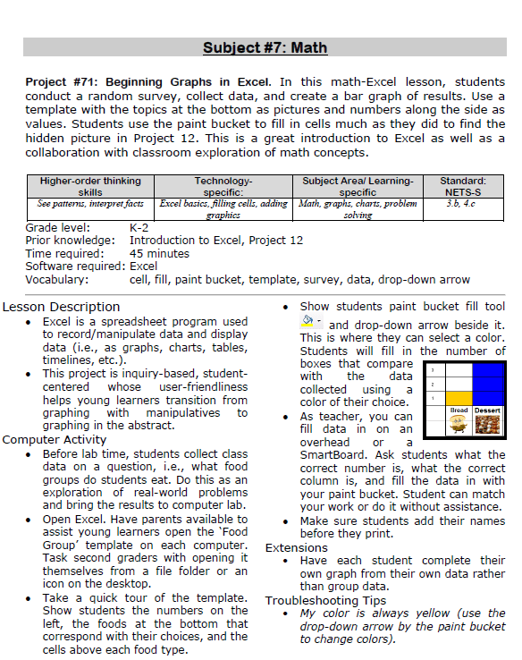 - A brief summary of each project, including suggested grade level and prior knowledge, time required, software required