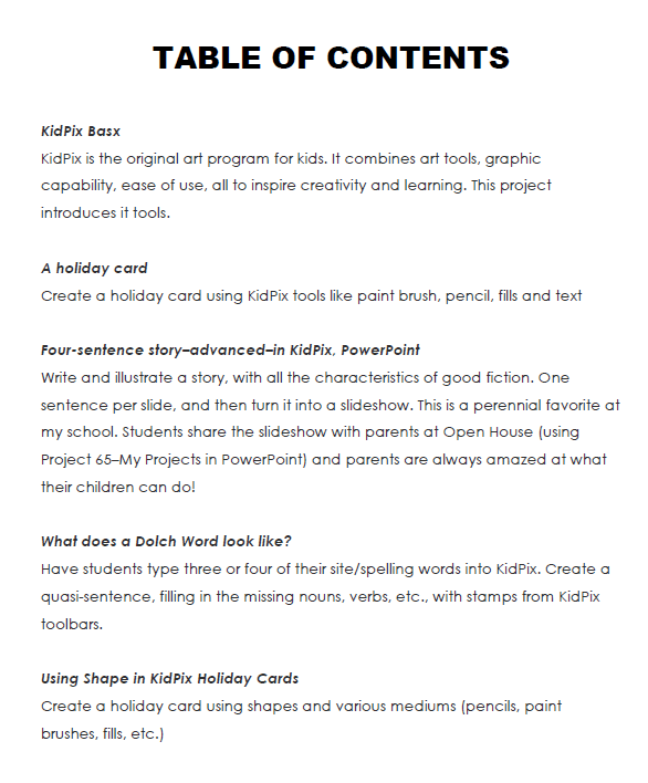 - A brief summary of each project, including suggested grade level and prior knowledge, time required, software required