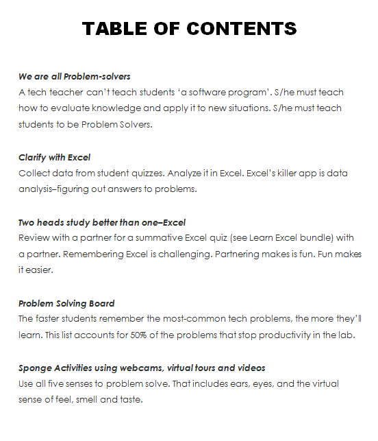 A tech teacher can’t teach students ‘a software program’. S/he must teach how to evaluate knowledge and apply it to new situations. S/he must teach students to be Problem Solvers.
