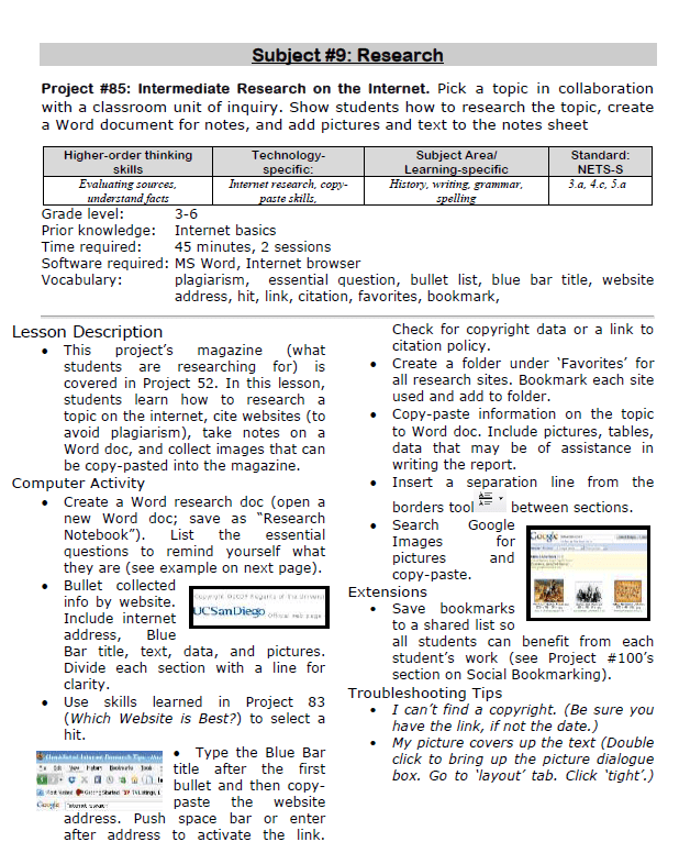 Students learn to research information for a class report and organize it, complete with outline, citations, text and pictures.
